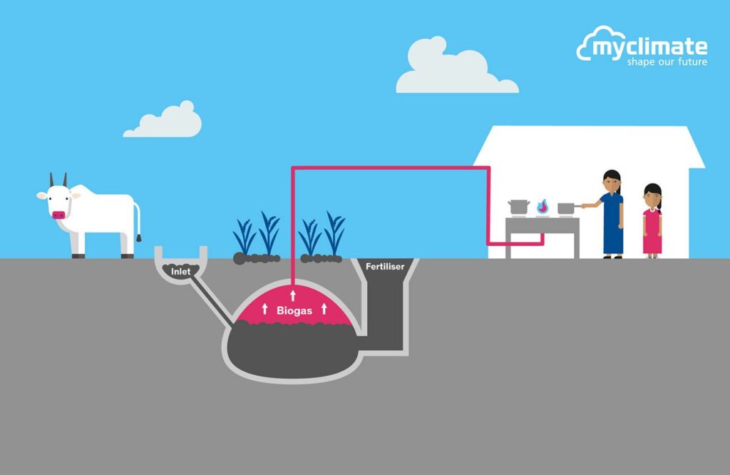 The operation of biogas systems reduces the demand for non-sustainably used firewood and at the same time reduces CO₂ emissions as a result of deforestation and combustion of the wood. The installed dome-shaped systems are developed in Nepal and provide enough energy for a family with at least two cows or buffaloes. The cattle manure is mixed with water and added to the system. Anaerobic decomposition of the organic matter promotes the formation of biogas, which is fed into the kitchen via pipe connections and used for cooking.